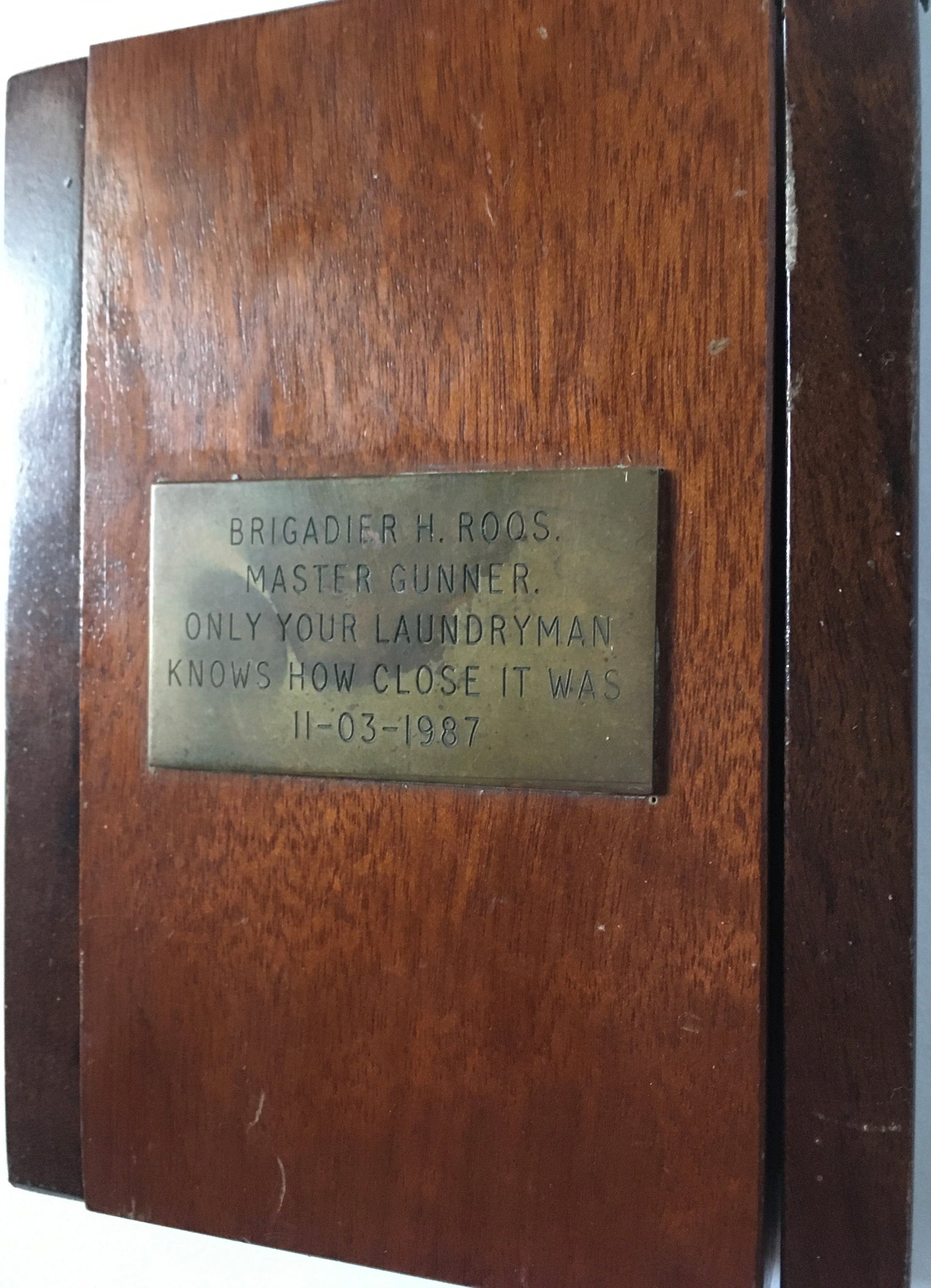Plaque reads "BRIGADIER H. ROOS MASTER GUNNER. only your laundryman knows how close it was 11-03-1987"